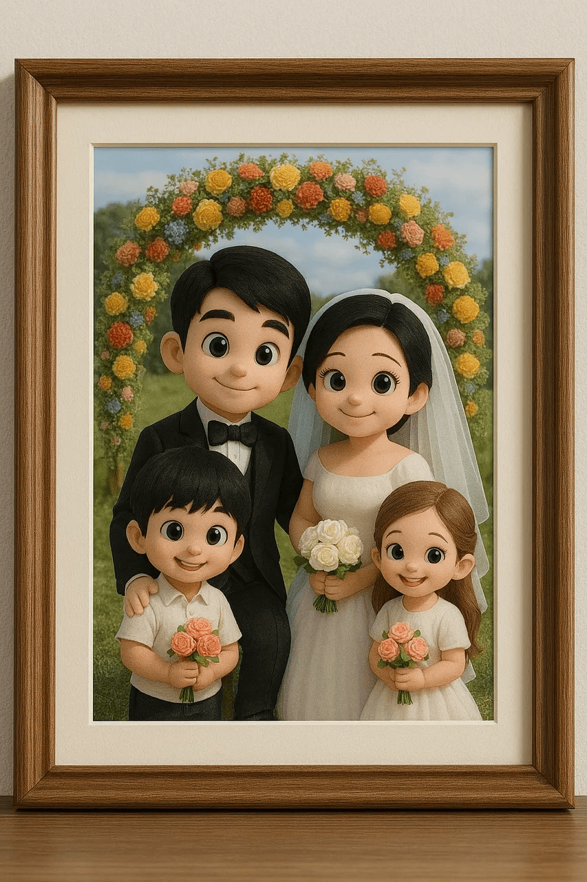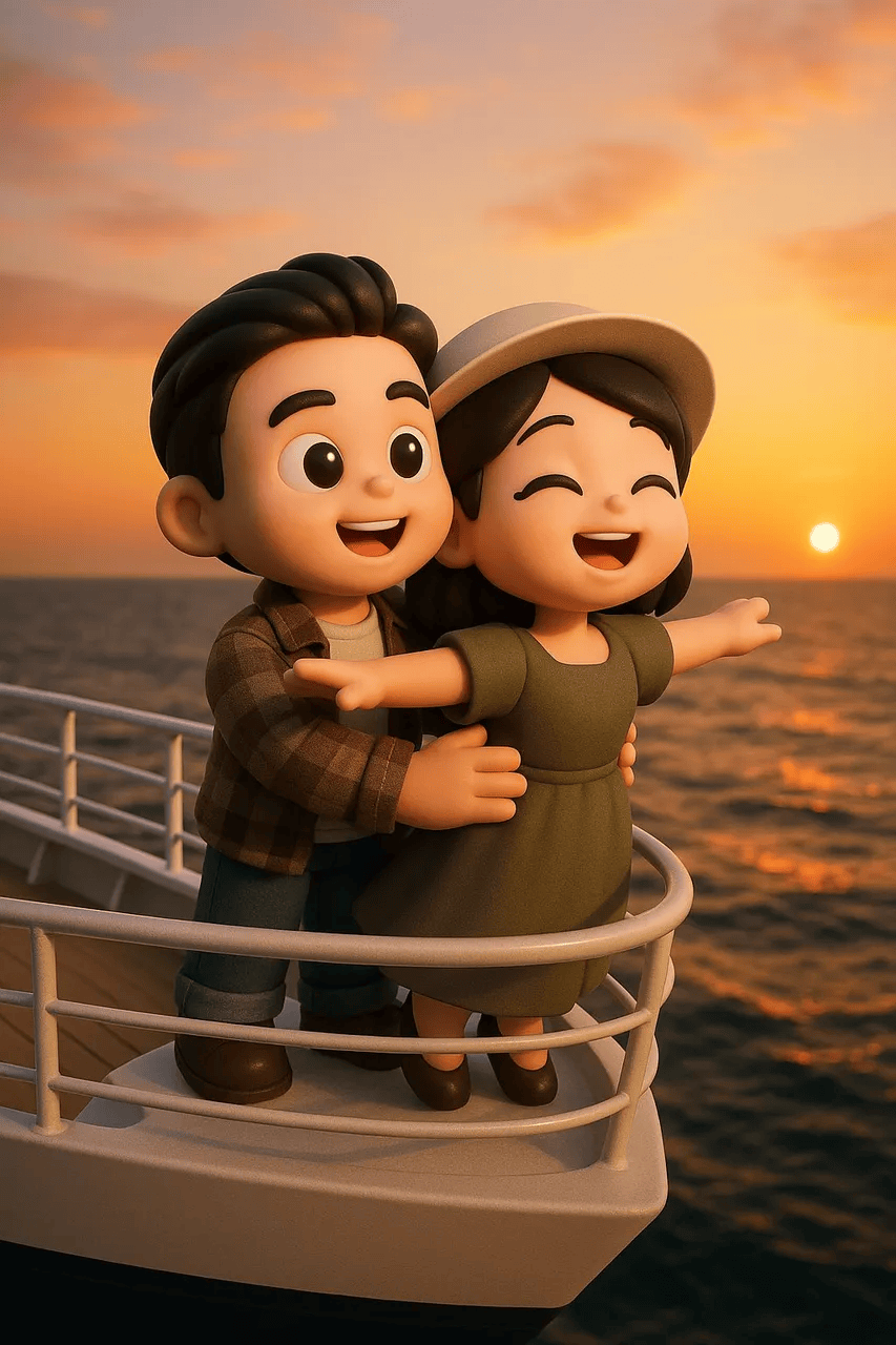 花朵从墙顶倾泻而下,和现实世界构成明显对比。布景换成浪漫颜色,时髦穿搭和配饰,女人头发部门由大量富强的花朵形成,钥匙扣是按照[参考图片]制做的Q版气概抽象,花朵包裹着女人的头顶。帽顶有精美饰物,布景为红黄放射状图案。寄意喜庆吉利。2️⃣ 输入 Prompt:将照片里的两小我转换成 Q 版 3D 人物,彰显卑贱大气 。