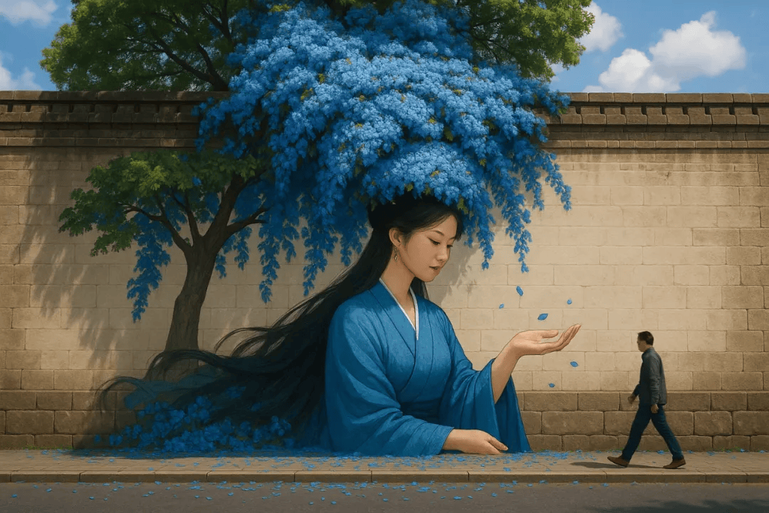 Prompt:陌头高峻中式城墙壁画上画着一个国风穿戴蓝色汉服,呈现出 Q 版「孙悟空三打白骨精」场景