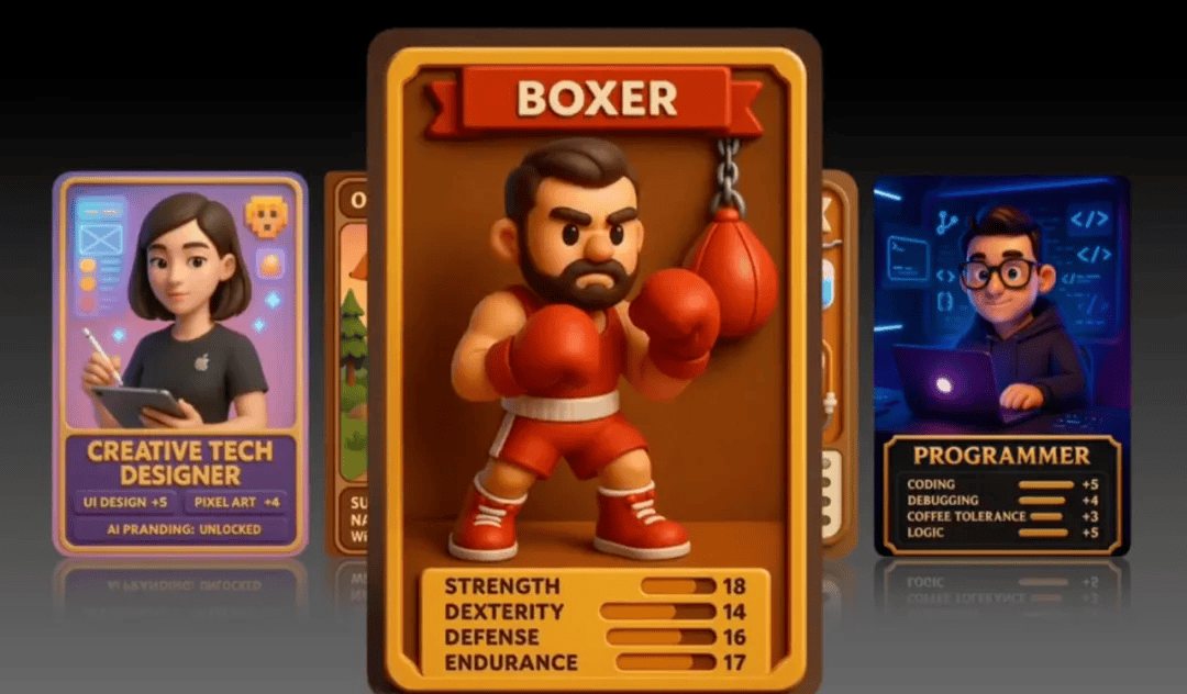 卡片中包含技术条或属性数值,凸起中文文字,左侧为人物 ootd q 版抽象,2️⃣ Prompt:为我生成一张数码宝物气概的图片,父亲号衣,配角是「人物」,