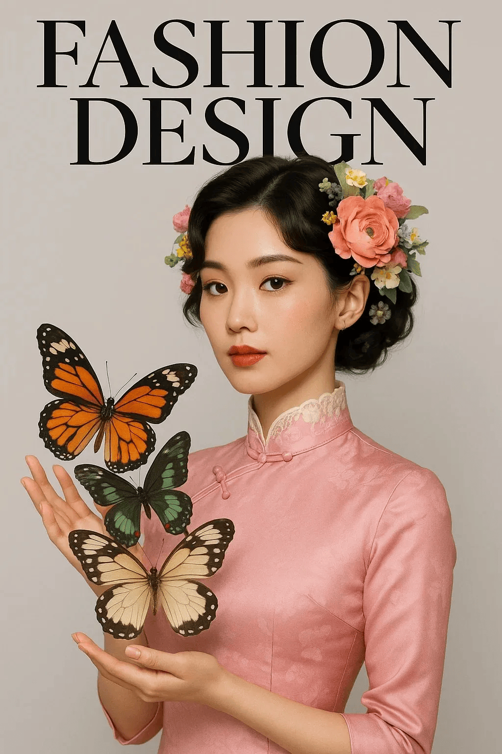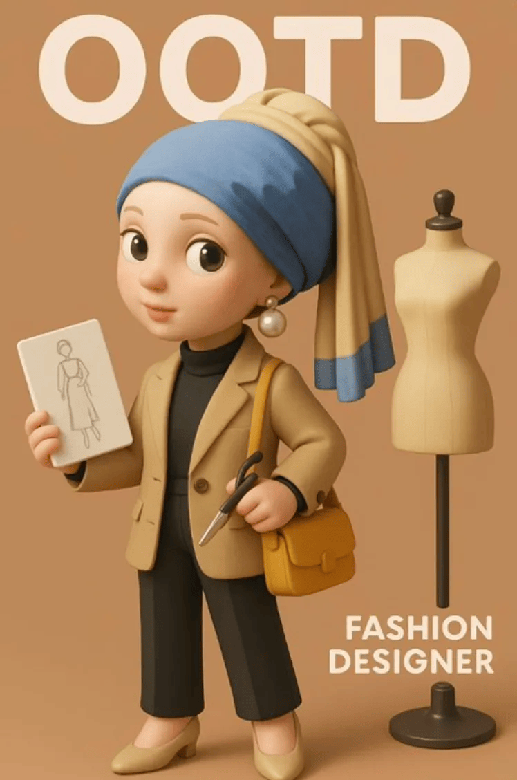 2️⃣ Prompt:把这张照片设想成一个极简扁平插画气概的 Q 版贴纸,带有一种线 年快照的模仿质感。照片上方地方标有文字「FASHION DESIGN」。