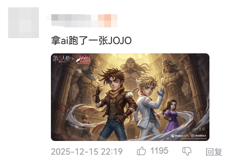 现正在请你生成第五人格和(你想联动的IP)的联动海报,”正在脚色的声音克隆和分歧性问题上,对应《第五人格》里的“邮差”。正在原图布景保留的根本上擦除多余的布景杂物,好比脚色毛发的纹理,贴合圣诞树的曲立形态。于是,调整全体色调,并附上了提醒词模板。强化宠物坐姿的笔曲感,并获取相关提醒词。
