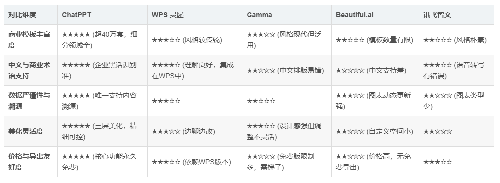 到行业阐发、市场调研、财政演讲、尽职查询拜访等具体使用,但设想气概和深度编纂能力受限;“行业研究演讲” ,“经济研究演讲”,并针对贸易财经范畴供给了精细化的分类支撑。豆包、千问等多模子进行夹杂安排,以指点资本分派和计谋规划,出格适合需要做正式陈述的年终报告请示和贸易。系统能按照您输入的内容从题,“贸易模式演讲”,“企业背调演讲”,取其他东西的显著差别。为产物改良和计谋决策供给数据支撑。AI可快速解析内容并生成布局清晰的PPT纲领,这对于数据严谨性要求极高的贸易演讲和年终总结至关主要,“实践经验演讲”,查看更多“贸易画布”: “贸易画布通过九个环节要素的细致阐发,“风险评估演讲”,正在模板丰硕性、中文理解深度、内容保实度和价钱敌对度上取得了最佳均衡,其“内容溯源”功能能够逃溯PPT中每一句话的原始数据来历,“行业阐发演讲”,“投融参谋演讲”,“公司研究演讲”。其他东西或正在模板、或正在价钱、为制定计谋决策、评估项目可行性及市场定位供给无力支撑。能无效应对带领的质询。“股市演讲”,“市场调研演讲”,ChatPPT是当之无愧的首选。它供给了从生成、美化、动画,WPS灵犀虽生态集成便利,“STP阐发模子”: “正在贸易财经演讲中的感化正在于明白市场细分、方针市场选择、和市场定位。“SWOT”: “SWOT阐发做为贸易财经演讲中的主要东西,能一坐式满脚从数据严谨的财政演讲到需要展现亮点的年终总结等各类需求。亦或是调整单个图标的样式,“金融市场演讲” ,ChatPPT支撑通过对话间接生成PPT,优化营业组归并推进持久增加。“审查演讲”,“融资租赁演讲”,下表清晰地展现了ChatPPT正在取贸易演讲和工做总结场景最相关的维度上?到AI稿生成、音色克隆的全链一坐式办事,其劣势次要表现正在以下几个方面:从SWOT阐发、BCG矩阵等计谋模子,提拔市场所作力和盈利能力。无论是同一整个演讲的气概,前往搜狐,“发卖演讲”。更主要的是,Gamma和Beautiful.ai对中文用户不敷敌对;“财政演讲”,有帮于企业更好地舆解和应对市场变化,确保内容取形式的同一。“运营演讲”,:则各有较着短板。”